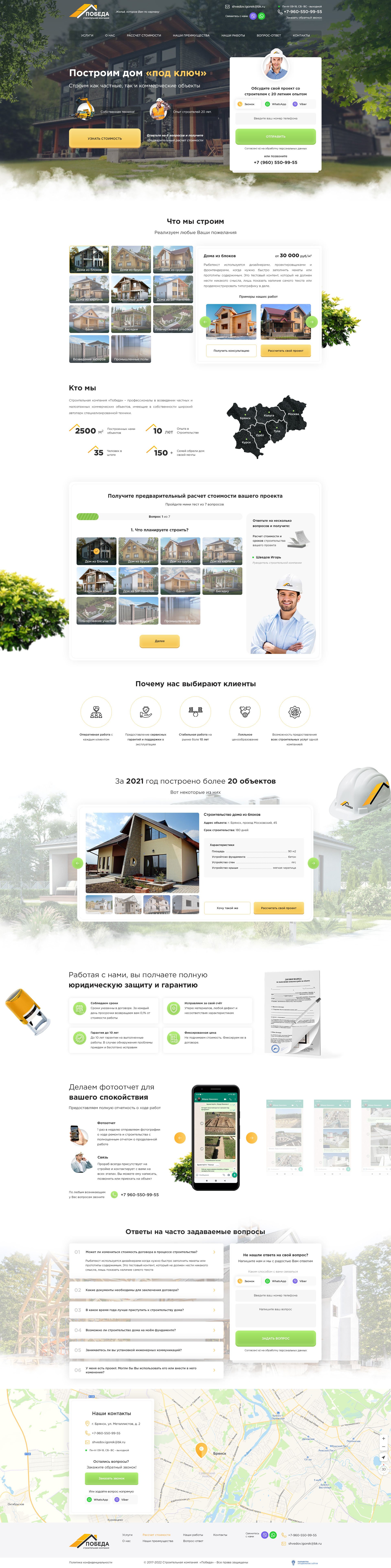 Цель: Разработать стильный одностраничный сайт с уникальным дизайном для строительной компании «Победа». В Landing-page был так же внедрен квиз-опросник для повышения лидогенерации, который помогает посетителю оставить заявку в играющей форме, ответив всего лишь на несколько интерактивных вопросов.